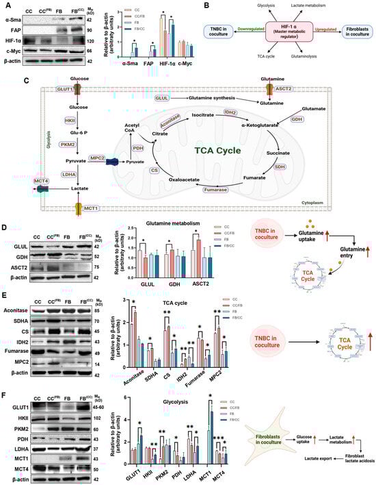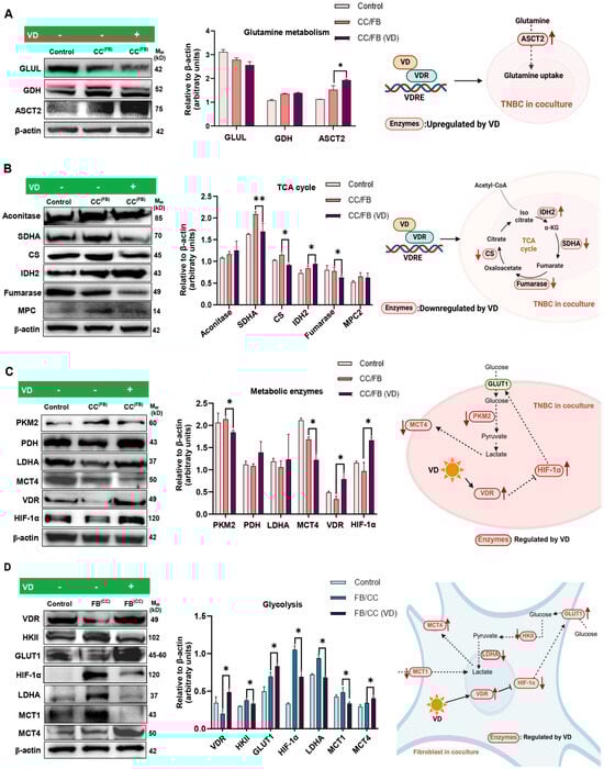Background: Triple-negative breast cancer (TNBC) is more likely to metastasise to the lungs than other breast cancer (BrCa) types, yet the molecular interactions within the tumour microenvironment (TME) at secondary sites remain poorly understood. Methods: This pilot study aimed to explore the metabolic crosstalk between MDA-MB-231 TNBC cells and MRC-5 lung fibroblasts within a co-culture system to replicate the lung metastatic TME. Co-cultures were also treated with Vitamin D or Vitamin E to evaluate the effects of these nutraceuticals on the metabolic crosstalk between TNBC cells and fibroblasts. Results: Our findings demonstrate that co-culture induced the activation of fibroblasts into cancer-associated fibroblasts (CAFs), evidenced by increased α-SMA and FAP expression. Metabolic profiling revealed that TNBC cells in co-culture displayed increased expression of enzymes associated with oxidative phosphorylation (OXPHOS) and glutamine metabolism, while fibroblasts exhibited a metabolic profile consistent with glycolysis and lactate metabolism. Vitamin D inhibited lactate metabolism and HIF-1α expression in fibroblasts while suppressing TCA cycle activity in cancer cells, suggesting a potential role in disrupting oncogenic metabolic crosstalk. Conversely, Vitamin E treatment was associated with increased expression of TCA cycle and oxidative metabolism-related markers in BrCa cells without significantly affecting fibroblast glycolysis. Such differential metabolic responses may contribute to metabolic heterogeneity within the tumour microenvironment. Conclusions: These results provide valuable insights into the metabolic dynamics of TNBC metastases in the lung TME and demonstrate that Vitamins D and E exert distinct effects on metabolic crosstalk between cancer cells and fibroblasts. These findings may have significant implications for the potential supplementation of Vitamins D and E in patients with metastatic TNBC and justify further in-depth analysis.