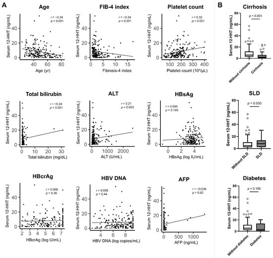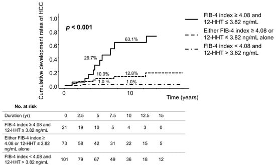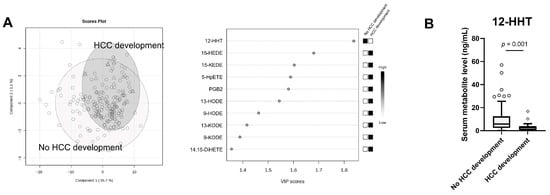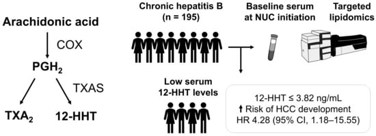 Background/Objectives: Alterations in polyunsaturated fatty acid (PUFA) metabolites have been linked to the development of hepatocellular carcinoma (HCC). However, the association between PUFA metabolites and HCC development during nucleos(t)ide analogue (NUC) therapy in patients with chronic hepatitis B virus infection remains unclear. Methods: This study enrolled 195 NUC-naïve patients who received NUC therapy. Associations between metabolic factors—especially PUFA metabolites—and HCC development during NUC therapy were evaluated. Baseline serum concentrations of 158 PUFA metabolites were quantified using targeted lipidomic analysis. Results: Nineteen patients developed HCC during the follow-up period. The cumulative incidences of HCC at 5 and 10 years were 7.7% and 12.4%, respectively. Variable importance in projection analysis identified 12-hydroxyheptadecatrienoic acid (12-HHT) as the top-ranked metabolite differentiating patients with and without HCC development. Furthermore, 14 metabolites were significantly associated with HCC development based on the log-rank test with 12-HHT being the most significant predictor. The cumulative incidences of HCC at 5 and 10 years were 13.7% and 24.7%, respectively, in patients with 12-HHT concentration ≤ 3.82 ng/mL compared with 3.3% at both time points in those with 12-HHT concentration > 3.82 ng/mL (p < 0.001). In multivariate analysis, low 12-HHT concentration (≤3.82 ng/mL; p = 0.027; hazard ratio [HR], 4.28; 95% confidence interval [CI], 1.18–15.55) and a fibrosis-4 index ≥ 4.08 (p = 0.005; HR, 5.19; 95% CI, 1.64–16.41) were significantly associated with HCC development during NUC therapy. Conclusions: Pre-treatment 12-HHT represents a novel predictive biomarker for HCC development during NUC therapy.