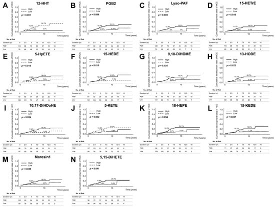 Background/Objectives: Alterations in polyunsaturated fatty acid (PUFA) metabolites have been linked to the development of hepatocellular carcinoma (HCC). However, the association between PUFA metabolites and HCC development during nucleos(t)ide analogue (NUC) therapy in patients with chronic hepatitis B virus infection remains unclear.