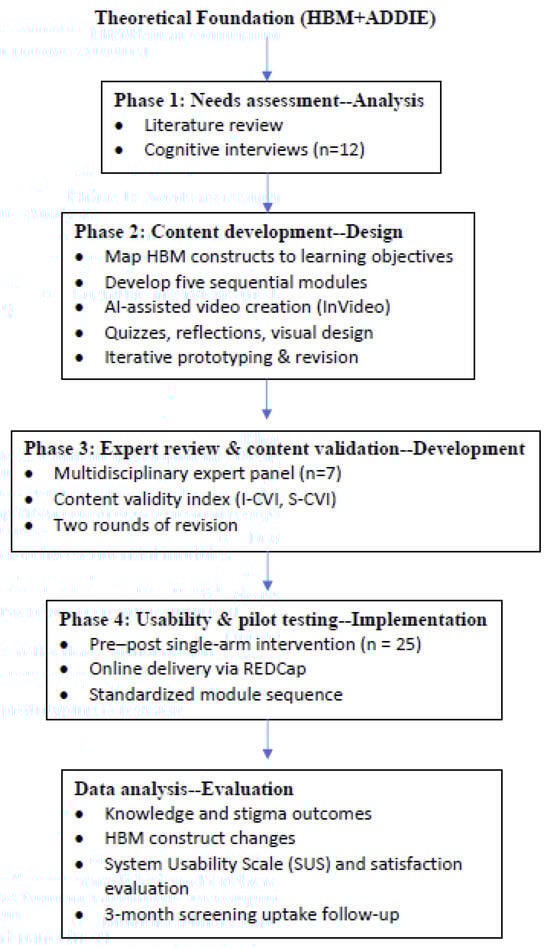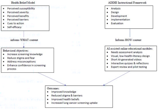 Background: Despite clear evidence supporting low-dose computed tomography (LDCT) for lung cancer screening, the participation rate among eligible high-risk individuals remains low. Educational interventions that address gaps in knowledge, attitude, and beliefs may improve screening uptake. Objective: This study describes the systematic use of artificial intelligence to design and develop a series of online educational modules aimed at improving knowledge, attitudes, and beliefs toward lung cancer screening among high-risk individuals. Methods: Guided by the Health Belief Model and principles of digital health education, five interactive online modules were developed by artificial intelligence technology to address key topics: (1) lung cancer epidemiology, etiology, signs, and symptoms; (2) lung cancer treatment and care; (3) lung cancer prevention methods; (4) screening guidelines, benefits, and risks; and (5) screening procedures and results interpretation. The design process included literature review, individual cognitive interviews, expert consultation, and pilot testing among target users. Qualitative individual interviews were conducted with 12 high-risk individuals. Content validity was evaluated by an expert panel (n = 7) using a content validity index (CVI), and pilot usability testing was conducted with 25 high-risk individuals. Results: All five modules achieved high content validity (I-CVI range = 0.90–1.00; S-CVI = 0.96). Usability and satisfaction testing showed that participants rated the modules as clear, engaging, and relevant (mean System Usability Scale score = 88/100, mean satisfaction score = 18.32/20). Participants demonstrated significant improvements in knowledge (p < 0.001), lung cancer stigma (p < 0.001), and health beliefs (p < 0.001) after module completion. Of the 22 participants who completed the 3-month follow-up (88%), 13 (59.1%) reported obtaining LDCT screening. Conclusions: The developed online modules demonstrated strong content validity and usability, indicating their feasibility for use in future intervention studies to promote lung cancer screening knowledge, attitude, beliefs, and participation among high-risk individuals.