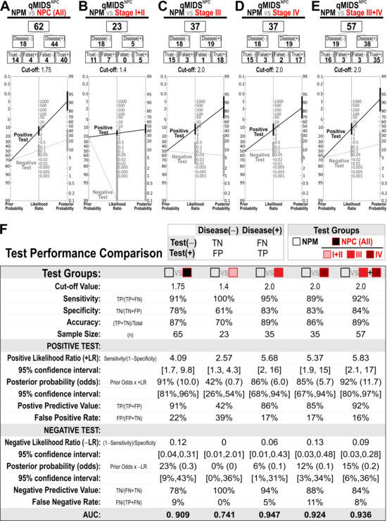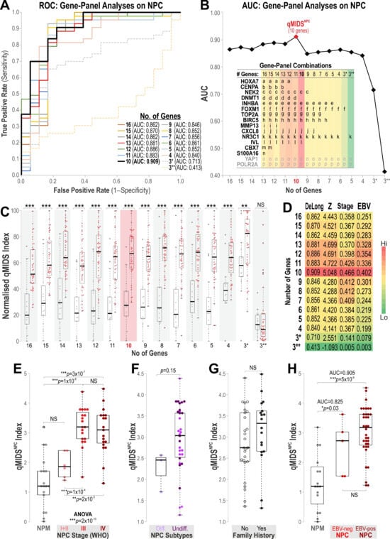 Background: We previously pioneered a multigene mRNA test, qMIDSV2, validated through an international multicohort study with geographically and ethnically diverse oral squamous cell carcinoma (OSCC) patients from Europe and Asia. This study aimed to repurpose the qMIDSV2 test for nasopharyngeal carcinoma (NPC). A molecular test independent of Epstein–Barr virus (EBV) status would be clinically useful for risk stratification in NPC patients with undetectable or low levels of EBV. Methods: This study investigated a Chinese cohort of 62 participants (18 donated normal nasopharyngeal mucosa (NPM) and 44 donated NPC tissue samples). Messenger RNA levels of 16 genes in each sample were quantified using the qPCR method, and an algorithm computed a malignancy index for cancer risk stratification. Results: We identified a unique 10-gene panel (containing eight target genes, namely NEK2, INHBA, FOXM1, TOP2A, BIRC5, CXCL8, NR3C1, and IVL, relative to two reference genes, YAP1 and POLR2A, collectively named qMIDSNPC) that demonstrated the best overall diagnostic performance in segregating NPM from NPC, with AUC = 0.909 and positive/negative predictive values of 91% PPV and 78% NPV, respectively. Furthermore, we demonstrated prognostic value of qMIDSNPC in segregating NPM from NPC stage III + IV, with AUC = 0.936, 92% PPV, and 84% NPV. Conclusions: Here, we present a simple qPCR-based 10-gene mRNA test, qMIDSNPC, with potential clinical utilities for rapid (1 h) prognostic stratification of NPC. Further studies involving geographically and ethnically independent NPC cohorts would be needed to validate the clinical use of qMIDSNPC in non-endemic NPC populations.