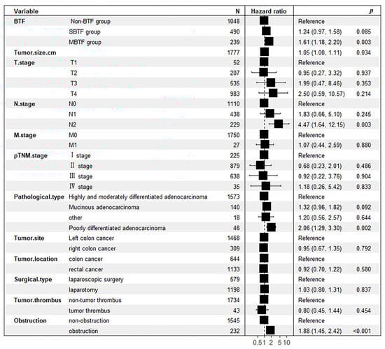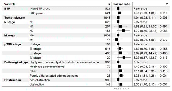 Background/Objectives: Perioperative blood transfusion (BTF) remains controversial regarding its impact on oncological outcomes in colorectal cancer (CRC). This study aimed to evaluate the association between BTF, transfusion volume, and long-term prognosis in CRC patients undergoing radical resection. Methods: We conducted a retrospective cohort study of 1777 CRC patients who underwent radical surgery at the Fourth Hospital of Hebei Medical University between December 2007 and April 2015. Propensity score matching (PSM) was applied to minimize selection bias between BTF and non-BTF groups. Logistic regression identified factors associated with BTF receipt. Cox proportional hazards models assessed the association between BTF and 5-year overall survival (OS). X-tile analysis determined optimal cut-off values for transfusion volume stratification. Results: Among 1777 patients, 729 (41.02%) received BTF. After PSM, 524 well-matched pairs showed balanced baseline characteristics. Intestinal obstruction was independently associated with BTF requirement (p < 0.001). The BTF group demonstrated significantly inferior 1-, 3-, and 5-year OS compared with non-BTF groups in both overall and PSM cohorts (all p < 0.01). Multivariate Cox analysis identified BTF as an independent adverse prognostic factor (HR = 1.44, 95% CI 1.09–1.89, p = 0.01). X-tile analysis stratified patients into non-BTF, small-volume (≤4 units), and massive-volume (>4 units) groups. Massive-volume transfusion showed the poorest survival outcomes (p < 0.0001) and was independently associated with worse OS (HR = 1.61, 95% CI 1.18–2.20, p = 0.003). Supplementary analyses indicated that no independent association was observed between survival outcomes and either preoperative inflammatory markers or the specific timing and type of transfusion. Conclusions: BTF, particularly when exceeding 4 units, independently predicts inferior long-term survival in CRC patients following radical resection. These findings support the implementation of restrictive transfusion strategies in perioperative CRC management. Given its retrospective observational design, this study shows an association but does not establish causality, and our findings should be interpreted in light of the aforementioned limitations.