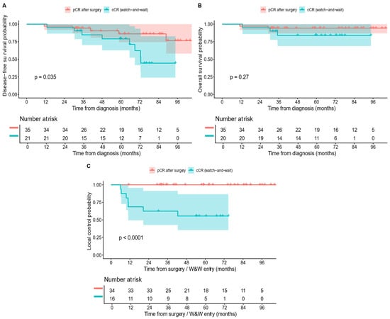 Background/Objectives: Total neoadjuvant therapy (TNT), integrating systemic chemotherapy and radiotherapy before surgery or surveillance, has become a standard approach for locally advanced rectal cancer (LARC). However, optimal sequencing strategies and long-term outcomes of watch-and-wait (W&W) following sandwich TNT remain insufficiently characterized. We evaluated oncologic outcomes and treatment response in patients treated with an institutional sandwich TNT protocol. Methods: We conducted a retrospective cohort study of consecutive patients with LARC treated with sandwich TNT (induction chemotherapy followed by hypofractionated intensity-modulated radiotherapy with simultaneous integrated boost [IMRT-SIB] chemoradiotherapy and consolidation chemotherapy) at the Institute of Oncology Ljubljana between 2016 and 2023. The primary endpoint was an overall complete response (CR; pathological [pCR] and clinical [cCR]). Secondary endpoints included tumor regression grade (TRG), major pathological response (MPR), R0 resection rate, organ preservation, overall survival (OS), and disease-free survival (DFS). Results: Among 205 patients (median age 61 years), overall CR was 29.5% (pCR 19.3% and cCR 10.2%). Major pathological response (TRG 3–4) occurred in 37.6%. R0 resection was achieved in 94.5%. In the W&W cohort (n = 21), local regrowth occurred in 33.3% (95% CI, 14.6–57.0%) over a median follow-up of 4.96 years. Total mesorectal excision (TME)-free survival at 5 years was 73.1% (95% CI, 55.0–97.2%). Estimated 5-year OS was 81.1% (95% CI, 75.5–87.2%) and 5-year DFS was 75.2% (95% CI, 69.0–82.0). In multivariable analysis, non-R0 resection (HR 6.06, 95% CI, 1.99–18.42), MRI circumferential resection margin positivity (HR 3.11, 95% CI, 1.53–6.33), and MRI extramural vascular invasion positivity (HR 1.97, 95% CI, 1.05–3.91) remained independent predictors of DFS. Conclusions: Institutional sandwich TNT yields meaningful tumor response and durable survival in MRI-defined high-risk LARC. Structured W&W offers organ preservation with acceptable oncologic control under intensive surveillance.