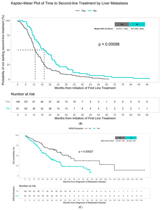 Background: The molecular and clinical underpinnings of worse overall survival outcomes with liver metastasis of CRC are not well-defined. We therefore aimed to investigate molecular and clinical characteristics of liver metastasis of CRC in this comparative study. Methods: Patients diagnosed with metastatic CRC from 2014 to 2022 were identified using the institutional molecular database of CRC. Demographic, clinical, and molecular data were collected and analyzed using Fisher’s exact tests for categorical variables, Kaplan–Meier analysis, and multivariate Cox regression analysis. Results: We identified 299 total patients with metastatic CRC, including patients with liver metastasis (n = 205) and non-liver metastasis (n = 94). We observed a significantly higher incidence of liver metastasis among patients with colon cancer compared to rectal cancer (74% vs. 48%, p = 0.00013). There was no significant difference in the incidence of common driver mutations, including KRAS, BRAF, and TP53, in the liver versus non-liver metastasis cohorts. There was a trend toward worse median overall survival among patients with liver metastasis, though this was not statistically significant (42.2 vs. 47.6 months, p = 0.27). Liver metastasis was identified as a significant predictor of shorter time on frontline therapy (HR 1.82, p < 0.001), a surrogate for treatment response, with a median time of 13 months from first- to second-line treatment compared to 19.7 months in the non-liver metastasis cohort (p = 0.00098). KRAS mutations were a significant predictor of worse survival in the liver metastasis cohort only (HR 2.01, p < 0.001), while BRAF mutations were a significant predictor in the non-liver metastasis cohort (HR 3.42, p = 0.006). Conclusions: Liver metastasis of CRC is associated with shorter time on frontline therapy, indicative of potential chemotherapy resistance. Given similar incidence of molecular alterations in patients with liver metastasis and non-liver metastasis, therapeutic resistance may instead be related to the tumor microenvironment of the liver. Most notably, this is the first study to reveal that despite a similar incidence of molecular alterations, driver alterations including BRAF and KRAS mutations may have a distinct impact on survival outcomes depending on the site of metastasis.