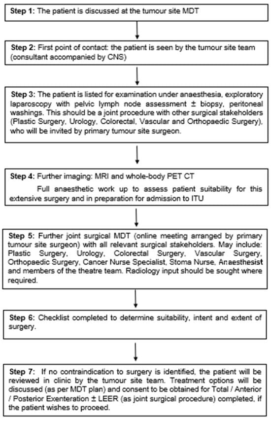 Background/Objectives: Pelvic exenteration is a complex surgery considered for locally advanced or recurrent pelvic malignancies, entailing a radical en-block resection of multiple adjacent pelvic organs, followed by reconstructive surgery. Achieving R0 resection (complete removal of macroscopic and microscopic disease) is critical for improving