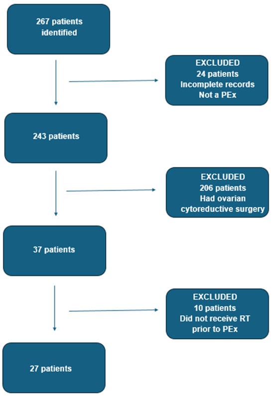 Background/Objectives: Pelvic exenteration is a complex surgery considered for locally advanced or recurrent pelvic malignancies, entailing a radical en-block resection of multiple adjacent pelvic organs, followed by reconstructive surgery. Achieving R0 resection (complete removal of macroscopic and microscopic disease) is critical for improving survival outcomes. This study aimed to define patient, tumour, and surgical predictors of R0 resection in an irradiated field, thereby optimising patient selection and establishing a surgical roadmap for pelvic exenterations. Methods: Our retrospective observational cohort study includes consecutive patients undergoing exenteration post-radiotherapy for non-ovarian gynaecological malignancies at Oxford University Hospitals between 1 January 2011 and 31 December 2024. The primary outcome was margin status. Secondary outcomes were intraoperative and postoperative complications. Results: Twenty-seven patients were identified, with a median age of 63 years (range 41–81) and median BMI of 27 (range 17–45). Primary tumour sites included the vulva (11.1%), vagina (14.8%), cervix (40.7%), and uterus (33.3%). R0 was achieved in 77.8% (n = 21) of cases. Intraoperative complications occurred in 29.6%, and significant postoperative complications (Clavien-Dindo IIIA/IIIB) in 22.2% of patients. R0 resection was significantly associated with younger age (median 61 vs. 70 years, p = 0.035) and primary cervical tumours (p = 0.036). On univariable logistic regression, tumour size on imaging (p = 0.038, OR 2.9) and on histology (p = 0.020, OR 2.01), and estimated blood loss (p = 0.048, OR 1.002) were significant predictors of R0 resection. None of these variables retained significance in multivariable logistic regression. Conclusions: Tumour size, primary tumour site, and patient age should be considered when selecting patients for pelvic exenteration following radiotherapy, and blood loss should be kept minimal in order to maximise the chances of achieving R0 resection.