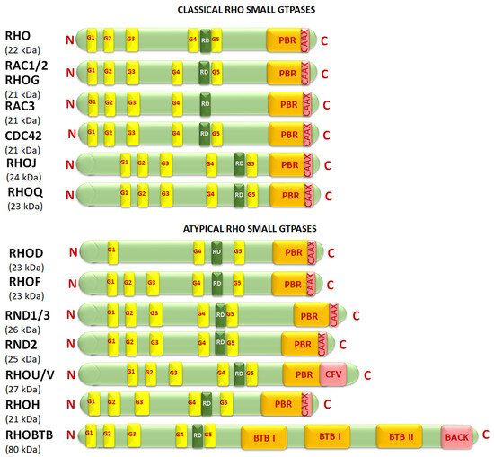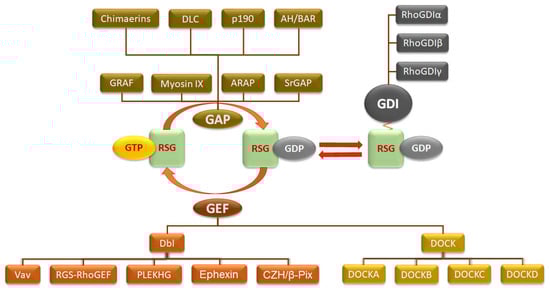 Background/Objectives: Rho small GTPases (RSG), which regulates metastasis, constitute eight subfamilies—“classical” Rho, Rac, cdc42, and “atypical” Rif, Rnd, Wrch, RhoH, and RhoBTB. Their downstream signaling requires switching between GTP-bound active and GDP-bound inactive forms. Classical RSGs, but not atypical RSGs, require regulation