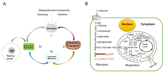 In healthy cells, the cytomatrix mechanics utilize mitochondrial respiration to control cytosolic motion and fine-tune the chemical processes. In cancer, the cytosolic motion is energized by glycolytic fermentation (the Warburg effect), which provides additional energy to supply the needs of the cytomatrix. Here,