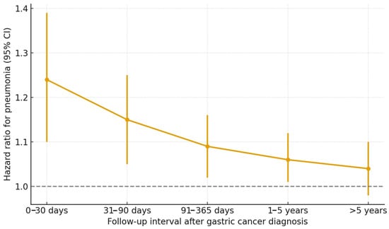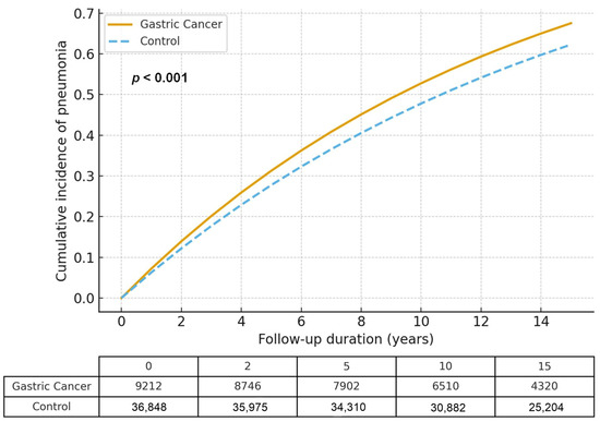 Background/Objectives: Gastric cancer (GC) remains a major global health burden, but its long-term association with pneumonia risk has not been comprehensively investigated. This study aimed to evaluate the long-term risk of pneumonia among GC survivors using a nationwide Korean cohort, focusing on chronic