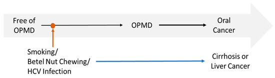 Background/Objectives: While smoking, areca nut chewing, and alcohol are established risk factors, Hepatitis C virus (HCV) infection has emerged as a potential risk for oral neoplasia. This study explores any association of HCV infection with oral potentially malignant disorder (OPMD) and oral cancer, following adjustment for HCV-related liver disease in a large screening cohort. Methods: Data from 37,720 participants in the Changhua Community-Based Integrated Screening Program (2005–2014) with smoking or areca nut use history were analyzed. OPMD and cirrhosis were identified at screening, while oral and liver cancers were diagnosed during follow-up. Information on demographics, lifestyle, and clinical factors, including chronic and active HCV infection, was collected. Multinomial logistic regression was used to assess associations between HCV status and disease outcomes. Results: The prevalence of hepatitis C viremia was higher in the OPMD group (4.4%) and oral cancer group (3.3%) compared to the screen-negative group (2.7%), and highest in the cirrhosis/liver cancer group (23.3%). The odds ratios of OPMD and oral cancer were 1.59 (95% CI: 1.20–2.01) and 1.22 (95% CI: 0.67–2.23), respectively, in subjects with hepatitis C viremia compared to those without. After adjusting for confounding factors, individuals with hepatitis C viremia were at increased risk of OPMD by 50% (aOR = 1.50; 95% CI: 1.17–1.92) but not a statistically significant elevated risk for oral cancer (aOR = 1.09; 95% CI: 0.59–2.01), which was possibly attenuated due to HCV-related liver disease (aOR = 11.59; 95% CI: 8.33–16.13). Conclusions: HCV infection may act as an early risk factor for OPMD, though its progression to oral cancer may occur alongside the risk of HCV-related liver diseases. Including HCV status in screening may aid early detection and secondary prevention of oral cancer in high-risk groups.