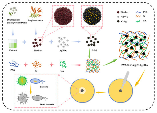 In this work, a novel polyvinyl alcohol/starch (PVA/St)-based composite film was fabricated by integrating citric acid (CA) and silver-loaded biochar (C-Ag) nanofillers to enhance antibacterial functionality. Sorghum straw-derived biochar was loaded with silver nanoparticles (AgNPs) through a green synthesis route using Peucedanum praeruptorum