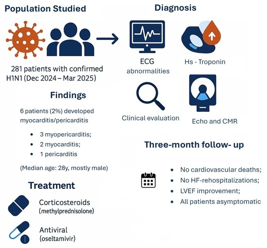 Background: Myocarditis is a potentially life-threatening inflammation of the myocardium that can be triggered by viral infections, including influenza. While corticosteroids have historically been used with caution in viral myocarditis due to concerns over impaired viral clearance, recent insights—particularly those emerging from the COVID-19 pandemic—suggest that early, moderate-dose corticosteroid therapy may offer clinical benefits in selected inflammatory cardiac syndromes. This study aimed to assess the incidence and clinical features, as well as short-term outcomes of influenza-related myocarditis and/or pericarditis. Methods: A retrospective, observational study was conducted, including all consecutive patients diagnosed with acute myocarditis and/or pericarditis between December 2024 and March 2025 who presented with chest pain or dyspnea and had a confirmed Influenza A (H1N1) infection. The diagnostic evaluation included cardiac biomarkers, ECG, TTE, and cardiovascular magnetic resonance (CMR). All patients were monitored during a three-month follow-up period. Results: Of 281 patients with laboratory-confirmed H1N1 infection, six (2%) were diagnosed with myocarditis and/or pericarditis. All patients diagnosed with myocarditis received corticosteroid therapy and an antiviral drug (oseltamivir). CMR confirmed the diagnosis in all cases of inflammatory cardiomyopathy. At 30 days, median LVEF improved from 49% to 58%. No deaths or rehospitalizations were reported. Conclusions: Influenza-related myocarditis and/or pericarditis are relatively uncommon, occurring in approximately 2% of cases. When they occur, they are primarily associated with an uncomplicated clinical course and with favourable short-term outcomes, including a rapid recovery of left ventricular function and the absence of adverse events at three-month follow-up.