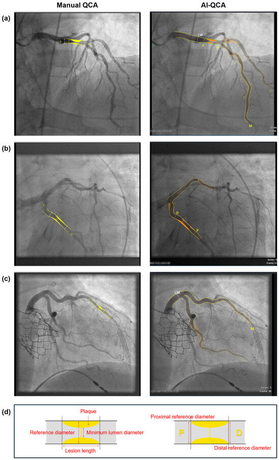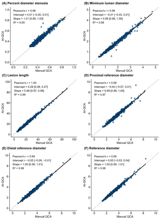 Artificial intelligence-based quantitative coronary angiography (AI-QCA) has recently emerged as a promising tool for real-time lesion assessment in cardiology. We aimed to validate a novel AI-QCA software, trained on a Korean dataset, in a European cohort. We analyzed 556 lesions from 252 subjects in two European datasets. The AI-QCA system performed automated vessel segmentation and measurements of minimum lumen diameter, proximal and distal reference diameters, percent diameter stenosis (%DS) and lesion length. The performance of AI-QCA was assessed using both automated and manual frame selection methods, with all measurements validated against expert manual QCA. AI-QCA achieved a lesion detection rate of 86.2% in automated frame selection. AI-QCA and manual QCA showed strong agreement (Pearson’s r > 0.90, R2 > 0.8 for all QCA measurements). For %DS categorization (<50%, 50% to <70%, and ≥70%), 433 lesions were classified into the same category by both methods, with a weighted κ of 0.832 (95% CI, 0.743–0.922). Vessel segmentation achieved a mean DSC of 0.953. This study validated the performance of AI-QCA using a European dataset and demonstrated high lesion detection rate and its strong agreement with manual QCA, which supports its applicability for real-time clinical decision-making during percutaneous coronary intervention.