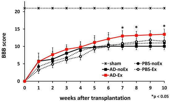 Mesenchymal stromal cell transplantation alone is insufficient when motor dysfunction is severe; combination therapy with rehabilitation could improve motor function. Here, we aimed to analyze the characteristics of adipose-derived MSCs (AD-MSCs) and determine their effectiveness in severe spinal cord injury (SCI) treatment. A