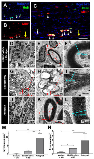 The in vitro derivation of Schwann cells from human bone marrow stromal cells (hBMSCs) opens avenues for autologous transplantation to achieve remyelination therapy for post-traumatic neural regeneration. Towards this end, we exploited human induced pluripotent stem-cell-derived sensory neurons to direct Schwann-cell-like cells derived from among the hBMSC-neurosphere cells into lineage-committed Schwann cells (hBMSC-dSCs). These cells were seeded into synthetic conduits for bridging critical gaps in a rat model of sciatic nerve injury. With improvement in gait by 12-week post-bridging, evoked signals were also detectable across the bridged nerve. Confocal microscopy revealed axially aligned axons in association with MBP-positive myelin layers across the bridge in contrast to null in non-seeded controls. Myelinating hBMSC-dSCs within the conduit were positive for both MBP and human nucleus marker HuN. We then implanted hBMSC-dSCs into the contused thoracic cord of rats. By 12-week post-implantation, significant improvement in hindlimb motor function was detectable if chondroitinase ABC was co-delivered to the injured site; such cord segments showed axons myelinated by hBMSC-dSCs. Results support translation into a protocol by which lineage-committed hBMSC-dSCs become available for motor function recovery after traumatic injury to both peripheral and central nervous systems.