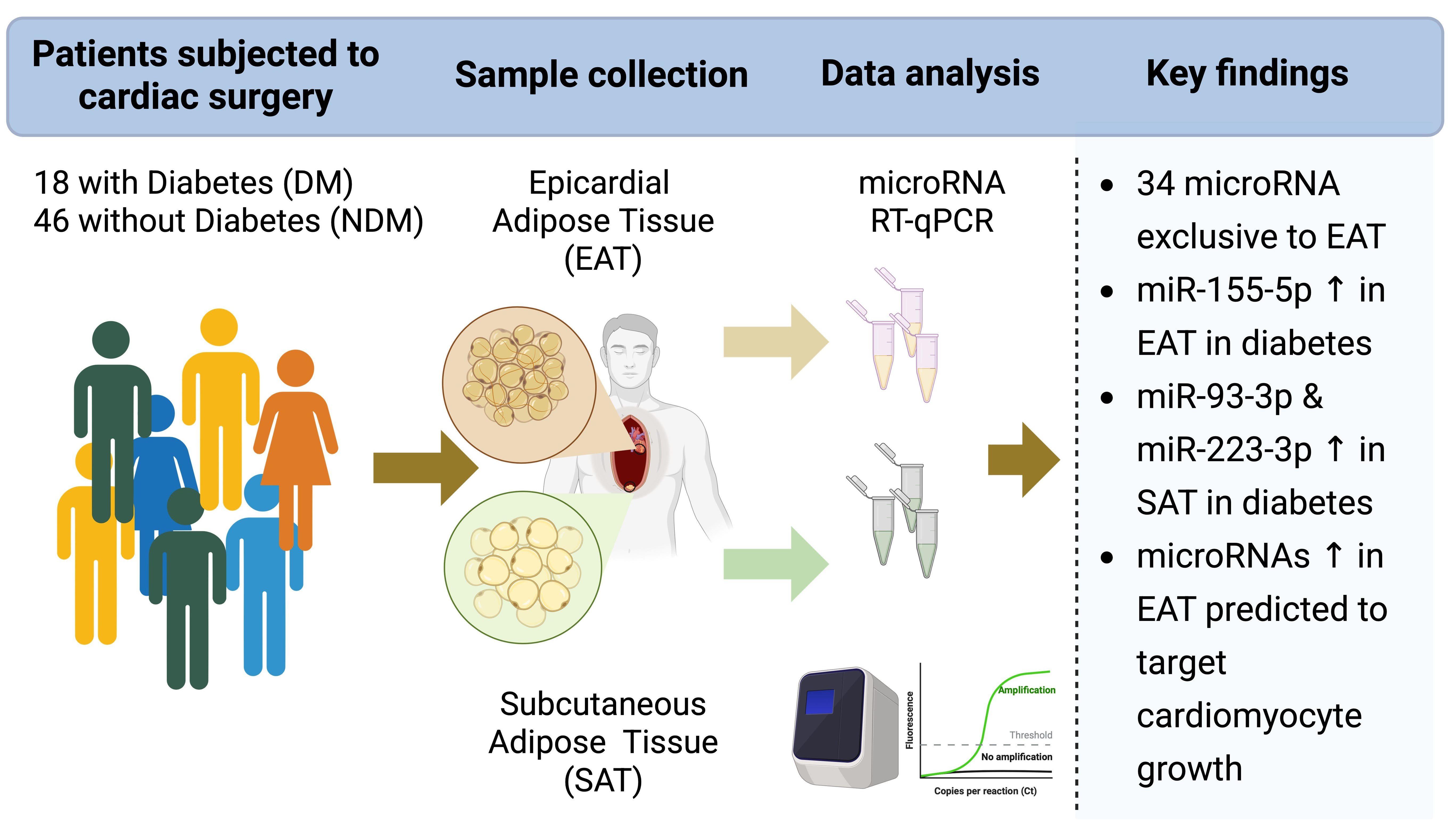 Epicardial adipose tissue (EAT) function may influence the heart, given its metabolic actions and proximity to the heart. We hypothesized that diabetes mellitus (DM) alters miRNA expression across adipose tissue types, and that modifications in EAT may have critical implications for cardiac physiology.