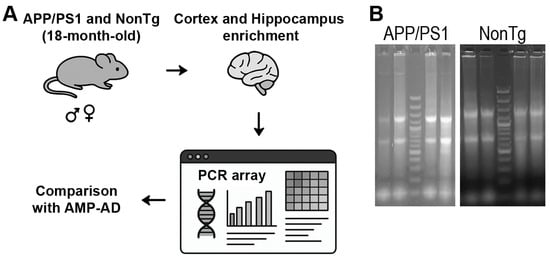 Alzheimer’s disease (AD) is increasingly recognized as a disorder that extends beyond amyloid-β (Aβ) and tau pathology. To this end, growing evidence suggests that aberrant neuronal cell cycle re-entry (CCR) may contribute to neurodegeneration. To investigate this mechanism, we profiled the expression of 84 cell cycle-related genes in the brains of aged APP/PS1 mice, a widely used transgenic model of AD, and compared them with age-matched non-transgenic littermates. Our analysis revealed 32 differentially expressed genes (DEGs), 8 of which exhibited significant changes (fold change > 2, p < 0.05). Several of these DEGs, including CDC7 and CCNC, displayed consistent dysregulation in human AD brains as assessed using the AMP-AD knowledge portal, supporting their translational relevance. Furthermore, integration with miRNA prediction analyses identified candidate post-transcriptional regulators of these DEGs, highlighting novel layers of regulation. Collectively, our results provide the first systematic overview of cell cycle gene dysregulation in aged APP/PS1 mice, establish cross-species concordance with human AD, and propose miRNA–gene interactions as potential contributors to neuronal vulnerability. These findings underscore the importance of cell cycle pathways in AD pathogenesis and point to new avenues for therapeutic exploration.
