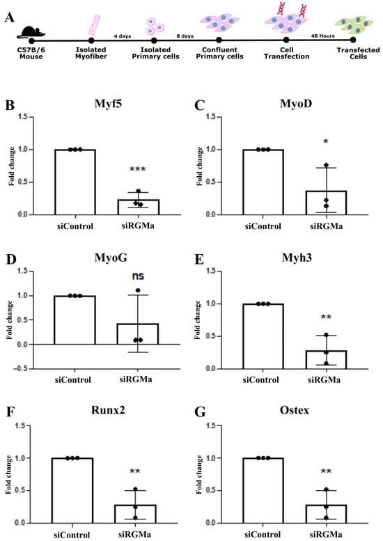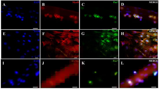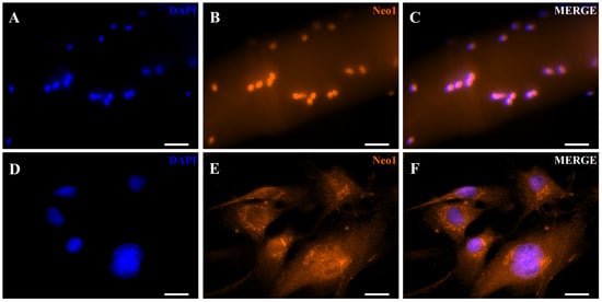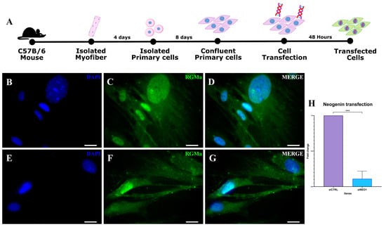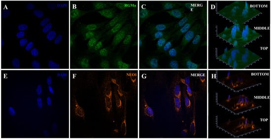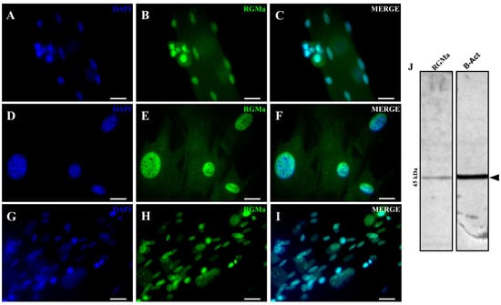 The Repulsive Guidance Molecule a (RGMa) is a multifunctional GPI-anchored protein localized in the sarcolemma and sarcoplasm of the adult skeletal muscle cell. Our research group showed that RGMa overexpression can promote myoblast fusion and induce hypertrophic muscle fibers during in vitro differentiation. Here, we report that RGMa is expressed in primary skeletal muscle cells cultured in vitro, showing a nuclear localization, revealed by immunostaining with an antibody targeting its C-terminal region (C-RGMa). While RGMa was detected in the nuclei, its canonical receptor, Neogenin, was predominantly found in the perinuclear region. Nuclear RGMa was absent in Neogenin-knockdown cells, suggesting that Neogenin mediates its nuclear transport. Functional assays suggested that RGMa promotes primary skeletal muscle cell viability and proliferation and supports their myogenic commitment. These findings reveal a previously unrecognized nuclear function of RGMa–Neogenin signaling and provide new insights into the regulation of skeletal muscle cell behavior in vitro.