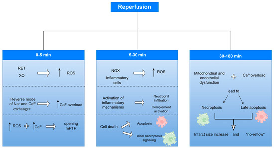 Myocardial ischemia represents a state of reduced coronary perfusion with oxygenated blood, insufficient to meet the metabolic demands of the myocardium. Both acute and chronic ischemia trigger a cascade of cellular events that lead to disturbances in ionic balance, mitochondrial function and energy metabolism. During ischemia, cardiomyocytes (CMs) shift from aerobic to anaerobic metabolism, resulting in adenosine triphosphate (ATP) depletion, loss of ionic homeostasis and calcium (Ca2+) overload that activate proteases, phospholipases and membrane damage. Reperfusion restores oxygen supply and prevents irreversible necrosis but paradoxically initiates additional injury in marginally viable myocardium. The reoxygenation phase induces excessive production of reactive oxygen species (ROS), endothelial dysfunction and a strong inflammatory response mediated by neutrophils, platelets and cytokines. Mitochondrial dysfunction and opening of the mitochondrial permeability transition pore (mPTP) further amplify oxidative stress and inflammation and trigger apoptosis and necroptosis. Understanding these intertwined cellular and molecular mechanisms remains essential for identifying novel therapeutic targets aimed at reducing reperfusion injury and improving myocardial recovery after ischemic events.