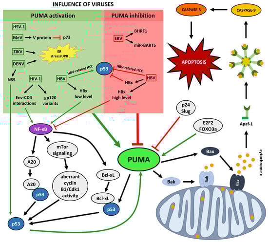 Apoptosis is a natural mechanism that shapes morphogenesis and helps maintain tissue homeostasis in healthy organisms. It is also extensively studied in the context of pathologies such as cancer and viral infections. The course of the latter strictly depends on host cell viability; therefore, regulators of apoptosis may play essential roles in distinct viral infections as well as virus-dependent diseases. The p53-upregulated modulator of apoptosis (PUMA), a pro-apoptotic member of the B-cell lymphoma 2 (Bcl-2) family, directly disrupts mitochondrial integrity, thereby promoting the intrinsic apoptotic pathway. PUMA-mediated cell death act as a double-edged sword that may either facilitate viral infection and its consequences or counteract them, depending on the infectious agent and the complex context of pathogen–host interactions. Accordingly, various viruses have evolved strategies to modulate host cell viability to their advantage by targeting PUMA—either by suppressing transcription of the PUMA gene, binding and inactivating the PUMA protein, or, conversely, inducing its production. In this work, we describe the role of PUMA in infections caused by distinct viruses and in associated diseases, viral strategies for modulating PUMA-related signaling pathways, and potential therapeutic implications.