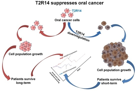 Oral cancer is a leading cause of cancer-related deaths and significantly affects the quality of life of patients. However, many of its mechanisms remain unclear, and its treatment needs improvement. The G-protein-coupled receptor taste receptor type 2 member 14 (T2R14 or TAS2R14) is
