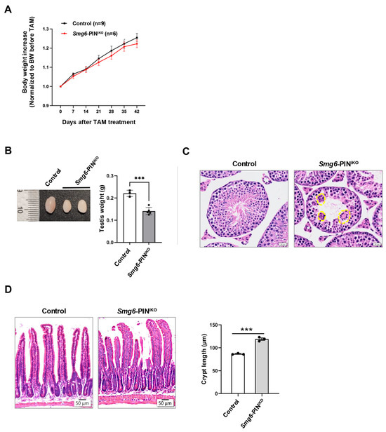 Nonsense-mediated mRNA decay (NMD) is a highly conserved RNA quality and quantity surveillance machinery in eukaryotic cells, serving as an important node in the post-transcriptional gene expression. Previous studies using the complete knockout of individual NMD factors in cells or animals reveal that NMD deficiency causes developmental defects and compromises tissue homeostasis. However, because most NMD factors participate in multiple molecular functions, a direct link between NMD and cell fate determination is missing. SMG6 is a core NMD effector and the only endoribonuclease among all NMD factors. The NMD function of SMG6 is exclusively mediated by its PIN (PilT N-terminus) domain. In this study, we engineered a mouse model with the capability of specifically deactivating the SMG6’s PIN domain/endoribonuclease activity (Smg6-PINF/F), but not knocking out the complete SMG6 protein. We found that SMG6’s PIN domain is essential for NMD activity in embryonic stem cells (ESCs) and various tissues of adult mice. Furthermore, loss of SMG6’s PIN domain is dispensable for the mouse ESC self-renewal, but severely compromises the differentiation, which consequently causes the mutant mice to die during the process of organogenesis. Through the induced deletion of SMG6’s PIN domain in adult mice, we found that loss of SMG6’s NMD function affects the homeostasis of several mouse tissues, including the testis and the intestine. In sum, our study establishes a mechanistic link between NMD per se and cell fate determination of mouse ESCs, as well as in the tissues of adult mice, where cell fate transitions are actively ongoing. The Smg6-PINF/F mouse line could be a valuable strain for elucidating the biology of NMD per se.