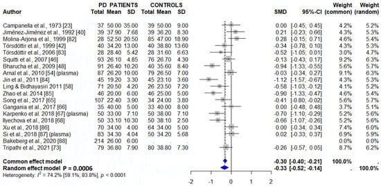 The present systematic review and meta-analysis aims to establish whether the brain, cerebrospinal fluid (CSF), serum/plasma whole blood, urine, and hair levels of copper, ceruloplasmin, zinc, and manganese are related to the risk for Parkinson’s disease (PD). We reviewed the PubMed and Web