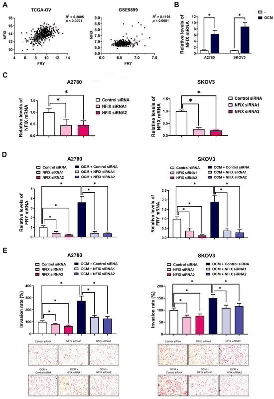 Ovarian cancer remains the most lethal gynecological malignancy, largely due to its early dissemination and extensive peritoneal metastasis. The tumor microenvironment (TME), particularly tumor-associated macrophages, promotes this invasive phenotype; however, the precise molecular effectors linking immune-to-tumor signaling remain unclear. We identified FRY, a microtubule-binding protein previously uncharacterized in ovarian pathology, as a critical mediator of macrophage-driven invasion. We observed that conditioned medium from ovarian cancer-stimulated macrophages (OCM) robustly induced FRY expression in ovarian cancer cells. Clinically, elevated FRY levels correlate with advanced tumor stage and poor patient survival. Functionally, FRY knockdown significantly abrogated OCM-induced invasion without affecting cell viability, highlighting its specific role in motility. Mechanistically, FRY facilitates epithelial–mesenchymal transition (EMT) and acts as an essential downstream effector of the PI3K/AKT signaling cascade; notably, FRY was required for AKT1-driven invasive behaviors. Furthermore, we identified the transcription factor NFIX as a key regulator of FRY expression. Macrophage-derived signals upregulate NFIX, which directly regulates FRY transcription. Pharmacological inhibition of the CXCR1/2 axis with reparixin effectively blocked OCM-mediated induction of both NFIX and FRY, suggesting that chemokine signaling initiates this pro-invasive loop. Collectively, these findings suggest that FRY is a macrophage-driven mediator of invasion and underscore its potential relevance in ovarian cancer.