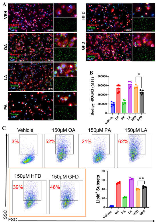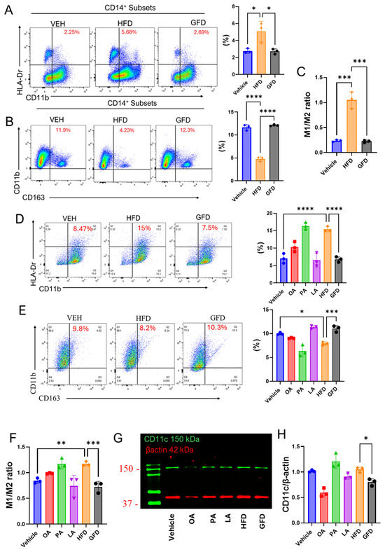 Dietary fats are consumed as mixtures, yet it remains unclear whether fatty acid composition, independent of fat content, dictates human macrophage polarization. We compared two defined mixtures containing identical fatty acids (palmitic, oleic, and linoleic acids) in different ratios: a palmitate-enriched mixture (4:3:3)