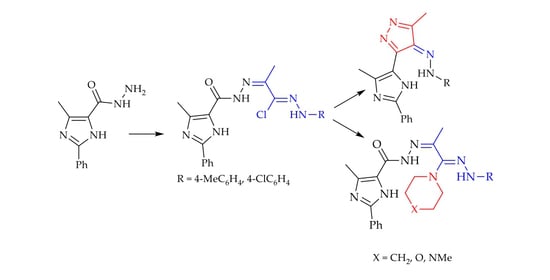 The reaction of imidazole-5-carbohydrazide 1 with hydrazonyl halides 2a,b gave the corresponding hydrazide–hydrazone derivatives 3a,b. Afterwards, 3-methyl-5-(4-methyl-2-aryl-1H-imidazol-5-yl)-4-(2-phenylhydrazineylidene)-4H-pyrazole 4a,b was affordably produced by cyclizing the latter compounds 3a,b in EtOH with