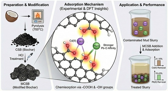 Insight into the Adsorption Behavior of Cd(II) and Pb(II) from Mud by HCl-Modified Coconut Shell Biochar: Experimental and DFT Studies