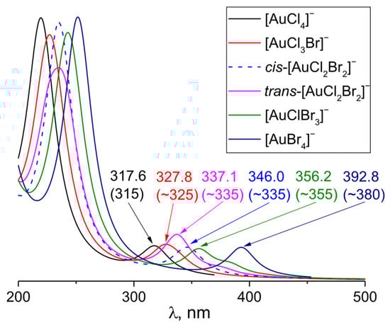 This paper presents accurate TD-DFT calculations for several mixed-ligand gold(III) complexes with ligands including Cl−, Br−, I−, OH−, and NH3. The calculated results show excellent agreement with available experimental data. The spectral shapes