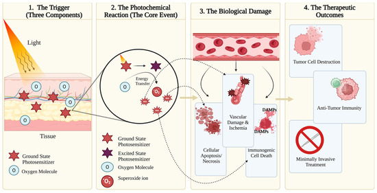 Photodynamic therapy (PDT) is a minimally invasive therapeutic modality that combines a photosensitizer, light of an appropriate wavelength, and molecular oxygen to generate cytotoxic reactive oxygen species for selective tissue destruction. Over recent decades, PDT has evolved from early porphyrin-based systems to advanced