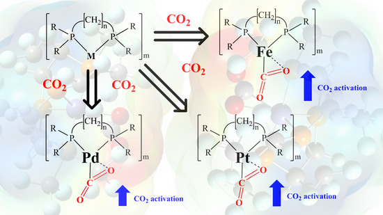 The activation of carbon dioxide by transition metal complexes is a fundamental process in catalysis and carbon capture. In this study, density functional theory (DFT) calculations, combined with Quantum Theory of Atoms in Molecules (QTAIM) and Natural Orbitals for Chemical Valency (NOCV) analyses, were employed to investigate the bonding characteristics and electronic structure of Fe(0)–, Pd(0)–, and Pt(0)–phosphine complexes with CO2. The Fe(0) complexes exhibited the strongest CO2 activation, characterized by substantial C=O bond elongation, significant charge transfer, and strong -backdonation. In contrast, Pd(0) complexes showed minimal CO2 activation, while Pt(0) complexes displayed intermediate behavior. The electronic effects of phosphine ligands were also analyzed, revealing that electron-donating phosphines enhance CO2 activation, whereas electron-withdrawing phosphines weaken metal–CO2 interactions. These findings provide key insights into the design of transition-metal-based catalysts for CO2 conversion and utilization.
