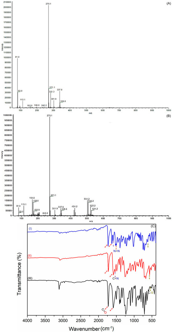 ![(A,B) Chemical ionization mass spectrometry (CI-MS) (NH3) of (A) BTBOPD and (B) ADOL. (C) FTIR spectra of (I) Ethyl 4-(benzo[b]thiophene-2-carbonyl)-pyruvate (2); (II) BTBOPD; and (III) ADOL.](https://mdpi-res.com/cdn-cgi/image/w=470,h=317/https://mdpi-res.com/chemosensors/chemosensors-14-00045/article_deploy/html/images/chemosensors-14-00045-g001-550.jpg)