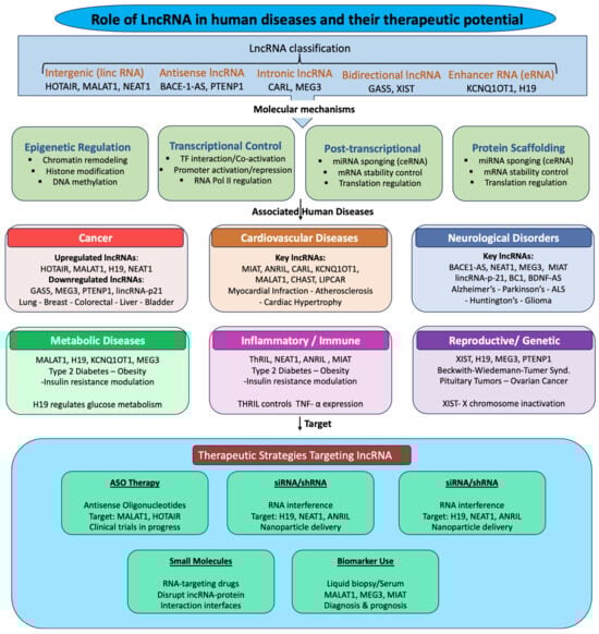 This Special Issue concentrates on the expanding field of long non-coding RNAs (lncRNAs) and their pivotal contributions to disease pathophysiology. While lncRNAs were once viewed merely as transcriptional noise, recent findings indicate they participate in diverse cellular functions, including gene regulation, chromatin remodeling, and RNA splicing. By integrating current research and advanced methodologies, this collection of articles aims to highlight how lncRNAs modulate molecular processes in cancer, neurodegenerative disorders, cardiovascular diseases, and more. The presented studies emphasize both basic and translational research, revealing how targeting or harnessing lncRNAs might shape new therapeutic strategies. Contributors discuss emerging technologies for lncRNA profiling, functional characterization, and validation, offering a roadmap for identifying disease-specific biomarkers and tailoring targeted interventions. Overall, this Special Issue seeks to stimulate discussion on the dynamic roles of lncRNAs, catalyzing future investigations and advancing the development of innovative treatments for diverse human diseases. These advances aim to foster meaningful clinical breakthroughs.