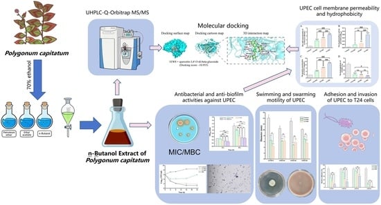 Uropathogenic Escherichia coli (UPEC) that form biofilms exhibit high-level antibiotic resistance, which poses substantial challenges to current therapeutic strategies for urinary tract infection (UTI). There is an urgent need for strategies specifically targeting UPEC biofilms. This study investigated the effects of the n-butanol extract of Polygonum capitatum (BPC) on UPEC strains, focusing on its antibacterial activity, biofilm formation, bacterial motility, adhesion capacity, and cell membrane integrity. The disk diffusion method, minimum inhibitory concentration (MIC), and minimum bactericidal concentration (MBC) assays demonstrated that BPC exhibited potent antibacterial activity against both reference and clinically isolated UPEC strains. Time–kill curve assays further confirmed that BPC inhibits bacterial growth in a time-dependent manner. BPC inhibited UPEC biofilm formation in a dose-dependent manner, significantly reducing biofilm formation in both reference and clinical UPEC strains. Furthermore, BPC disrupted cell membrane integrity in UPEC strain CFT073, resulting in the leakage of alkaline phosphatase (AKP), β-galactosidase, and intracellular proteins. BPC treatment also significantly reduced bacterial surface hydrophobicity, impaired swimming and swarming motility, and diminished adhesion and invasion capabilities. A total of 32 active compounds, predominantly flavonoids, were identified in BPC by UHPLC-Q-orbitrap MS/MS. Molecular docking studies revealed that several compounds in BPC, such as quercetin-3,4′-O-di-beta-glucoside, exhibited strong binding affinity to AKP and β-galactosidase, further supporting its potential to disrupt membrane integrity and inhibit biofilm formation. Thus, BPC exerts anti-UPEC effects through biofilm disruption and multi-targeted anti-virulence mechanisms, highlighting its potential as a novel therapeutic or adjunctive agent for UTI, particularly against recalcitrant biofilm-associated infections. The mode of action of BPC provides a scientific basis for developing new anti-infective strategies as alternatives to conventional antibiotics.