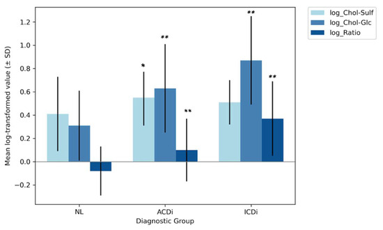 Background: Contact dermatitis (CD) is a prevalent inflammatory skin condition, with diagnostic challenges in distinguishing allergic (ACD) from irritant contact dermatitis (ICD). This study aimed to explore cholesterol-derived biomarkers as potential diagnostic tools. As cholesterol derivatives play key roles in skin barrier integrity and inflammation, they are promising candidates for assessing skin barrier disruption in CD. Methods: Stratum corneum samples were collected by tape stripping from experimentally induced and chronic lesions, as well as healthy non-lesional skin. Biomarkers Cholesterol Sulfate (Chol-Sulf), Cholesterol Glucosyl (Chol-Glc) and their ratio were quantified. Data were analyzed using ANOVA, Pearson’s correlation, logistic regression and ROC curves. Results: Chol-Glc and the Chol-Glc/Chol-Sulf ratio differed significantly across the diagnostic groups, while Chol-Sulf did not. Logistic regression and ROC analyses revealed a limited standalone diagnostic accuracy for the individual biomarkers (all AUC < 0.6). Conclusions: Chol-Glc and the ratio exhibit disease-specific patterns relevant for subtype discrimination. Although insufficient as independent diagnostic tools, these markers may contribute to future multivariate diagnostic models for CD diagnosis.