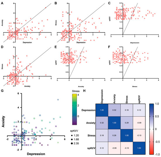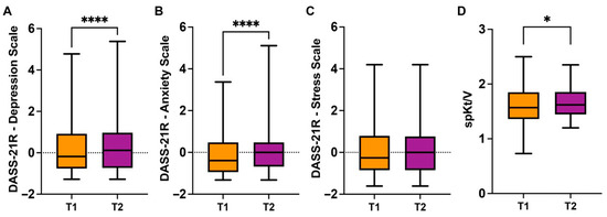 Background/Objectives: Chronic kidney disease (CKD) progresses with the gradual and irreversible loss of renal function. In Romania, given the increasing number of patients undergoing hemodialysis (HD), the prevalence of psychiatric symptoms and disorders in this population has become particularly significant. Although important advances have been made in the management of psychiatric conditions in HD patients, their mental health remains relatively poor. The aim of this study was to observe the severity temporal trends of depression, anxiety and stress symptoms and correlations among HD patients. Methods: A total of 173 patients, underwent a detailed anamnesis, with emphasis dialysis duration, comorbidities and a complex psychiatric evaluation, followed by the application of the Socio-economic Scale (SES-3); Mini Mental State Examination (MMSE); and the Depression, Anxiety and Stress Scale 21R (DASS-21R). The dialysis performance (spKt/V) and Charlson Comorbidity (CCI) indices were provided by DIAVERUM Nephrology and Dialysis Center in Craiova. Results: The severity of depression and anxiety symptoms significantly increased over six months, 0.248 ± 1.432 vs. 0.453 ± 1.488 (p < 0.0001; rrb = 0.296) for depression, and −0.090 ± 1.004 vs. 0.089 ± 1.047 (p < 0.0001; rrb = 0.252) for anxiety; while stress-like symptoms remained stable 0.080 ± 1.318 vs. 0.164 ± 1.357 (p = 0.0661; rrb = 0.123), despite improvements in dialysis adequacy (spKt/V). Depression scores were moderately correlated with anxiety and weakly correlated with stress and spKt/V. Anxiety results were moderately correlated with stress, while both anxiety and stress showed negligible correlations with spKt/V. Clinical variables assessed showed moderate predictive value for psychological outcomes in this cohort. Conclusions: Our study confirms the temporal trend of severity of mental symptoms and their persistence among HD patients, highlighting the urge to integrate mental health screening and intervention programs and a multidisciplinary team adapted for each case.