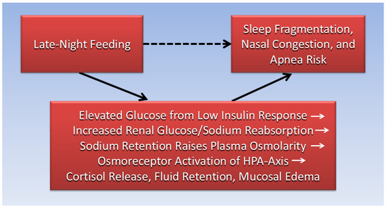 Late-Night Feeding, Sleep Disturbance, and Nocturnal Congestion Mediated by Hyperglycemia, Renal Sodium Retention, and Cortisol: A Narrative Review