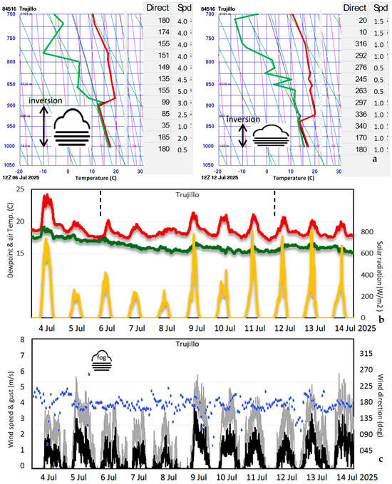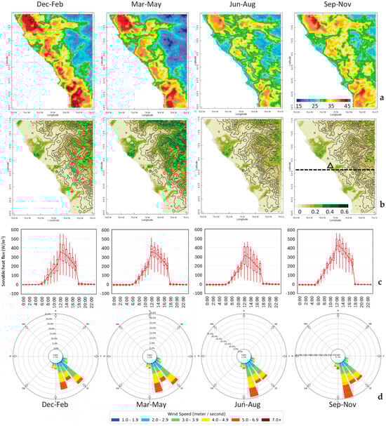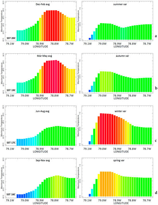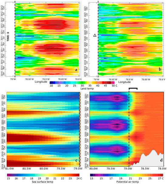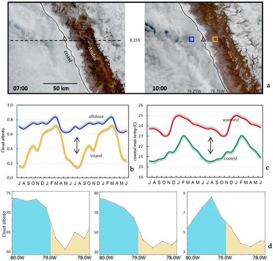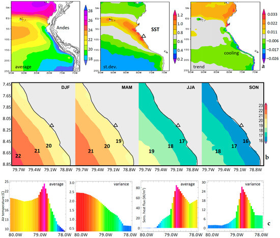 This study considers temperature gradients over recent decades near Trujillo, Peru, (8.15 S, 78.95 W) using high-resolution data assimilation. Statistical analyses describe a steep gradient from the cool foggy coast to the warm coastal plains below the Andes. A cross-coast transect is analyzed for seasonal changes in maximum air temperature from SENAMHI station data interpolated with satellite infrared measurements. Weather forecasts aimed at the urban area show a cool bias at higher temperatures and often under-represent the landward increase of 5 °C/10 km, induced by wind-driven upwelling and turbulent heat flux. Morning fog-stratus tends to delay diurnal heating on the beachfront, whereas, a few kilometers inland, warming occurs due to the segregating effect of channeled long-shore winds. Although seasonality is limited near Trujillo, winter exhibits the greatest variance of maximum temperature due to fluctuations of cloud albedo. Regressions of temperature time series onto meteorological fields identify that a subtropical trough/ridge pattern leads to higher winter values due to weaker upwelling, warmer sea temperatures, and reduced fog-stratus. Long-term trends for increased sea/land gradients have implications for the adaptation to climate change.
