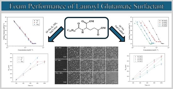 This study systematically compares how three counterions (Na+, K+, NH4+) regulate the interfacial properties, foaming behavior, and foam stability of lauroyl glutamate (LG) surfactants, and further examines how added NaCl modifies these properties in the sodium
