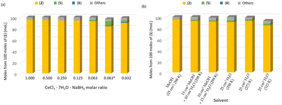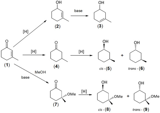 A systematic study of the chemoselectivity of the reduction of 3-methylcyclohex-2-enone (seudenone) to 3-methylcyclohex-2-enol (seudenol) was performed. Two approaches were investigated, namely the reduction of this ketone using NaBH4 with modifiers and Catalytic Transfer Hydrogenation (CTH). The former resulted in higher conversions (95–99%) and high selectivity (up to 95%), whereas with CTH, a selectivity of 100% was achieved, albeit with a low conversion. The study therefore demonstrated that it is possible to chemoselectively reduce an α,β-unsaturated ketone in the liquid phase CTH using MgO as the catalyst and 2-pentanol as the hydrogen donor. The application of modifiers such as CeCl3 · 7H2O and MCl2, where M = Be, Mg, Ca, Sr, and Ba, resulted in a significant improvement of the chemoselectivity (up to 95%) of the reduction with NaBH4. The effect of parameters such as the solvent mixture composition, reaction temperature and modifier:NaBH4 molar ratio was also investigated. In CTH, although high conversions of the ketone were observed for Al2O3, ZrO2 and MgO in the vapor phase, the first two did not yield 3-methylcyclohex-2-enol among the obtained products. It was shown that 3-methylcyclohex-3-enol was the main product of the transformations of 3-methylcyclohex-2-enone in the presence of MgO, with yields of 25–33%. In a series of experiments, it was shown that 3-methylcyclohex-3-enol is formed as a result of the transformation of 3-methylcyclohex-2-enol in the presence of MgO as a catalyst.