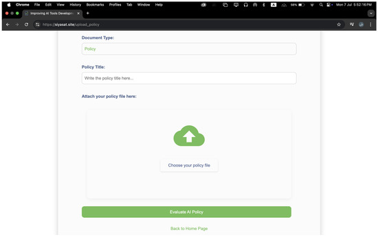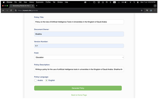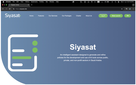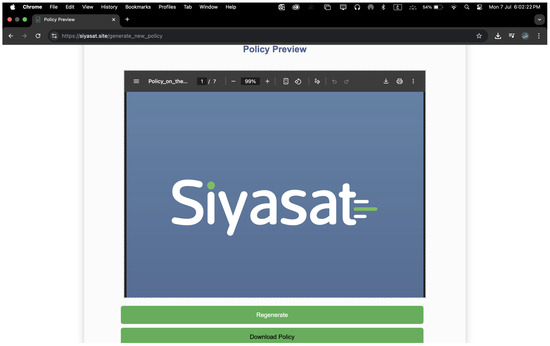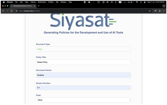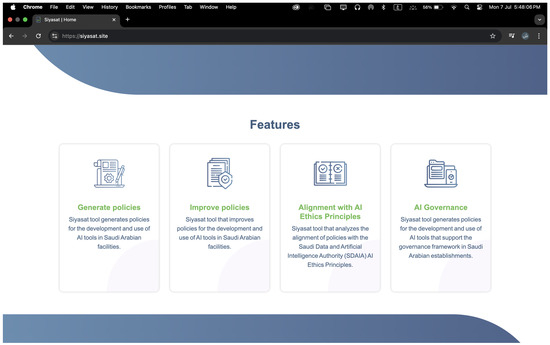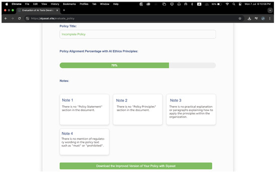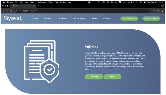 The rapid development of artificial intelligence (AI) and growing reliance on generative AI (GenAI) tools such as ChatGPT and Bing Chat have raised concerns about risks, including privacy violations, bias, and discrimination. AI governance is viewed as a solution, and in Saudi Arabia, the Saudi Data and Artificial Intelligence Authority (SDAIA) has introduced the AI Ethics Principles. However, many organizations face challenges in aligning their AI policies with these principles. This paper presents Siyasat, an Arabic web-based governance tool designed to generate and enhance AI policies based on SDAIA’s AI Ethics Principles. Powered by GPT-4-turbo and a Retrieval-Augmented Generation (RAG) approach, the tool uses a dataset of ten AI policies and SDAIA’s official ethics document. The results show that Siyasat achieved a BERTScore of 0.890 and Self-BLEU of 0.871 in generating AI policies, while in improving AI policies, it scored 0.870 and 0.980, showing strong consistency and quality. The paper contributes a practical solution to support public, private, and non-profit sectors in complying with Saudi Arabia’s AI Ethics Principles.