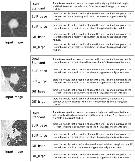 In the diagnosis of lung cancer, imaging findings of lung nodules are essential for benign and malignant classifications. Although numerous studies have investigated the classification of lung nodules, no method has been proposed for obtaining detailed imaging findings. This study aimed to develop a novel method for generating image findings and classifying benign and malignant nodules in chest computed tomography (CT) images using vision–language models. In this study, we collected chest CT images of 77 patients diagnosed with either benign or malignant tumors at Fujita Health University Hospital. For these images, we cropped the regions of interest around the nodules, and a pulmonologist provided the corresponding image findings. We used vision–language models for image captioning to generate image findings. The findings generated by these two models were grammatically correct, with no deviations in notation, as expected from the image findings. Moreover, the descriptions of benign and malignant characteristics were accurately obtained. The bootstrapping language–image pretraining (BLIP) base model achieved an accuracy of 79.2% in classifying nodules, and the bilingual evaluation understudy-4 score for agreement with physician findings was 0.561. These results suggest that the proposed method may be effective for classifying and generating lung nodule findings.