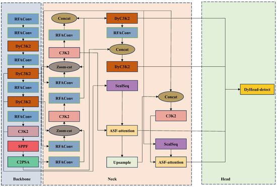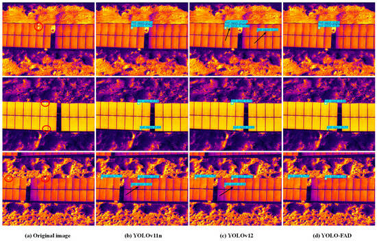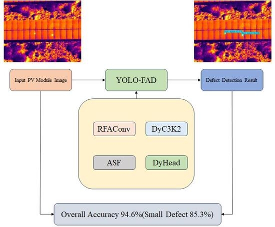 To improve the detection performance of small defects in photovoltaic modules, we propose an enhanced YOLOv11n model—YOLO-FAD. Its core innovations include the following: (1) integrating RFAConv into the backbone network and neck network to better capture small defect features in complex backgrounds; (2)