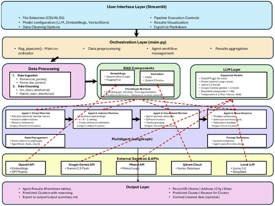 Entity resolution in real-world datasets remains a persistent challenge, particularly for identifying households and detecting co-residence patterns within noisy and incomplete data. While Large Language Models (LLMs) show promise, monolithic approaches often suffer from limited scalability and interpretability. This study introduces a multi-agent Retrieval-Augmented Generation (RAG) framework that decomposes household entity resolution into coordinated, task-specialized agents implemented using LangGraph. The system includes four agents responsible for direct matching, transitive linkage, household clustering, and residential movement detection, combining rule-based preprocessing with LLM-guided reasoning. Evaluation on synthetic S12PX dataset segments containing 200–300 records demonstrates 94.3% accuracy on name variation matching and a 61% reduction in API calls compared to single-LLM baselines, while maintaining transparent and traceable decision processes. These results indicate that coordinated multi-agent specialization improves efficiency and interpretability, providing a structured and extensible approach for entity resolution in census, healthcare, and other administrative data domains.