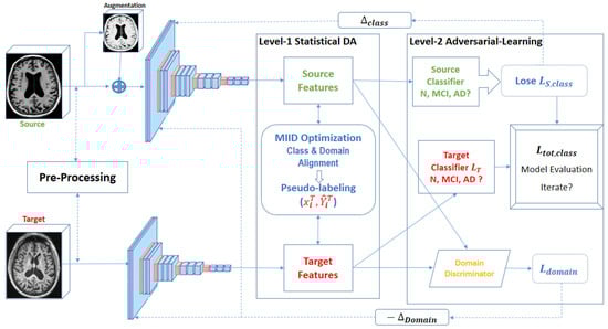 The design of an accurate cross-domain model for Alzheimer disease AD classification from MRI scans faces critical challenges, including domain shifts caused by acquisition protocol variations. To address this issue, we propose a novel unsupervised two-level adapting model for Alzheimer’s disease classification using