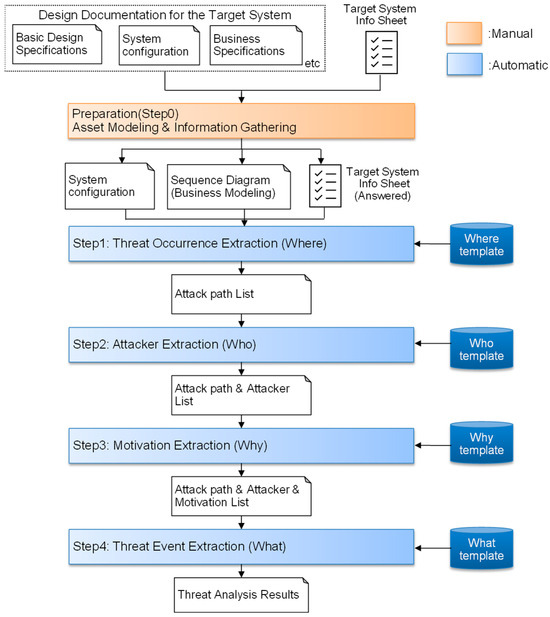 Security design for large-scale infrastructure systems requires substantial effort and often causes development delays. In line with NIST guidance, such systems should consider security design throughout a system development lifecycle. Nevertheless, performing security design in early phases of the lifecycle is difficult due to frequent specification changes and variability in analyst expertise, which causes repeated rework. The workload is particularly critical in threat analysis, the key activity of security design, because rework can inflate the workload. To address this challenge, we propose an automated threat-analysis method. Specifically, (i) we systematize past security design cases and develop “templates” that organize the system-configuration and security information required for threat analysis into a reusable 5W-based format (When, Where, Who, Why, What); (ii) we define dependencies among the templates and design an algorithm that automatically generates threat-analysis results; and (iii) observing that threat analysis of large-scale systems often yield overlaps, we introduce “business operations” as an analytical asset, which includes encompassing information, function, and physical resources. We apply our method to an actual large-scale operational system and confirm that it reduces the workload by up to 84% relative to conventional manual analysis, while maintaining both the coverage and the accuracy of the analysis.
