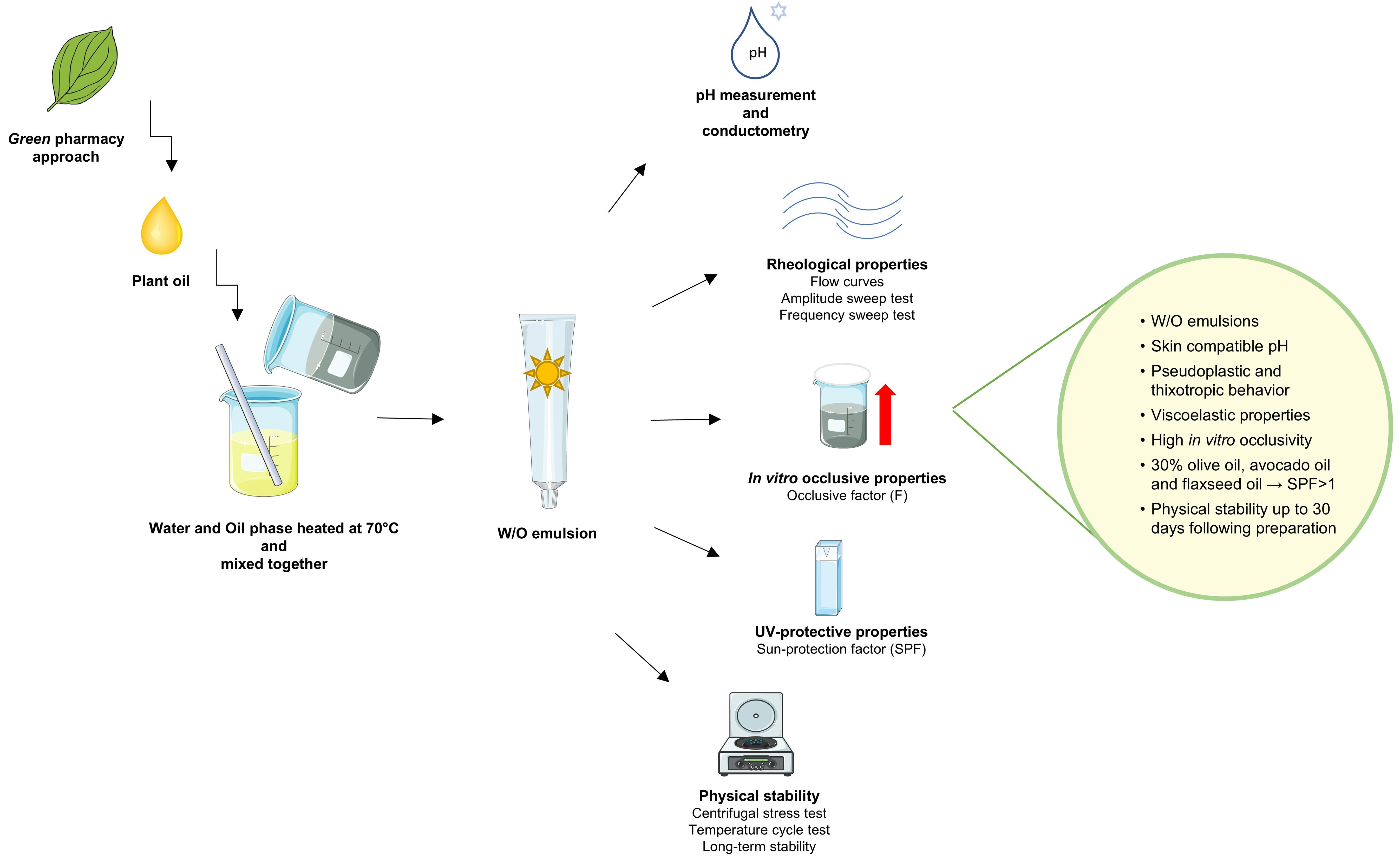 Plant oils are increasingly explored as sustainable functional ingredients in topical emulsions due to their emollient properties and reported photoprotective potential. This study aimed to formulate physically stable W/O emulsions containing selected plant oils (olive, avocado, sesame, flaxseed, and grape seed oils) at